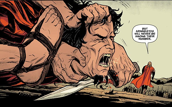 The violence in the book is presented in a matter-of-fact way that climaxes in the 5th issue. Each of our heroes uses one of their “strengths” to hold off the attacking Spartan army in their own unique way and stage their own personal rebellion. As Damar says in issue #3, “You could set Sparta aflame and dance on the corpses and it wouldn’t alter anything that has been done to us. The only revenge is living.” Since this story takes place during the death throes of the once great Sparta, it couldn’t be more true. The ending of 300 points out that the real victory of Thermopylae was the Spartans’ place in both stories and history. Three ends with the hope that a more detailed understanding of the subjugated Helots will help them live on as well. After all, those 300 Spartans may have held shields in their phalanx position, but the afterword of issue #1 posits that there were 300 Helots that carried the shields to the battle. They all died as well, so this totally cool comic is a successful attempt at similarly honoring their sacrifice.