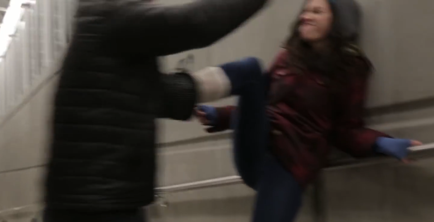 Noelle was just walking and then she started getting followed by this creepy dude. At first she was all, “He’s kinda Cute,” but then she was all, “but he looks kinda young.” Then he seemed like he was following her and another guy stopped her in this narrow hall and there was no one around for her to call out for so she decided that she better go all Jackie Chan on their A’s.
