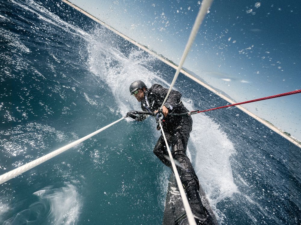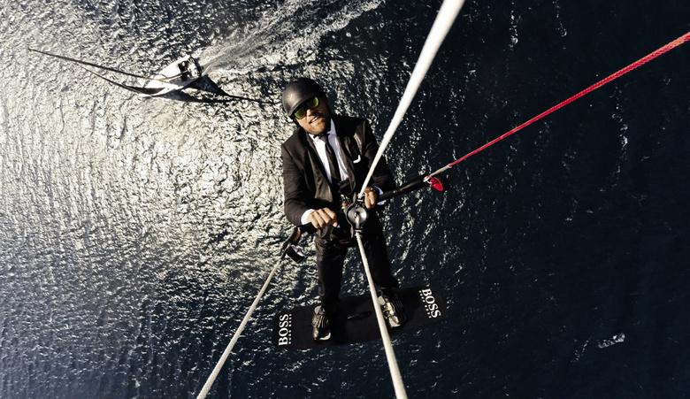 So, now that we are at the 2 year mark it is time for Thomson to do something extra crazy and this time it is a the #SKYWALK. This was done in partnership with BOSS as well as Mercedes-Benz under the tutelage of pro kite surfer Susi Mia and kite surfer coach Ray Casper. He starts kiteboarding while being pulled by the yacht. The boat then goes upwind and Thompson is carried up no less that 280ft in the process. It is stunning to watch, and he looks very James Bond doing it in that finally tailored BOSS suit. The video is below along with a diagram of the event and pictures to put it into perspective.