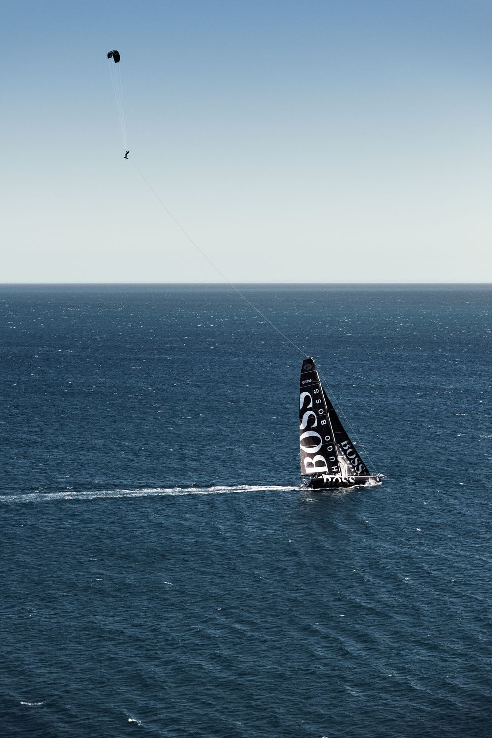 Well, Alex Thomson doesn’t fly, technically. He kitesurfs over the damn thing, and in style to boot. But first, let’s get a bit more background, shall we? Thomson is a round the world sailor that runs the HUGO BOSS boat. BOSS has been sponsoring Thomson since 2003 and this year he will be piloting the BOSS boat around the world by himself (!) in the Vendée Globe race held by the IMOCA.