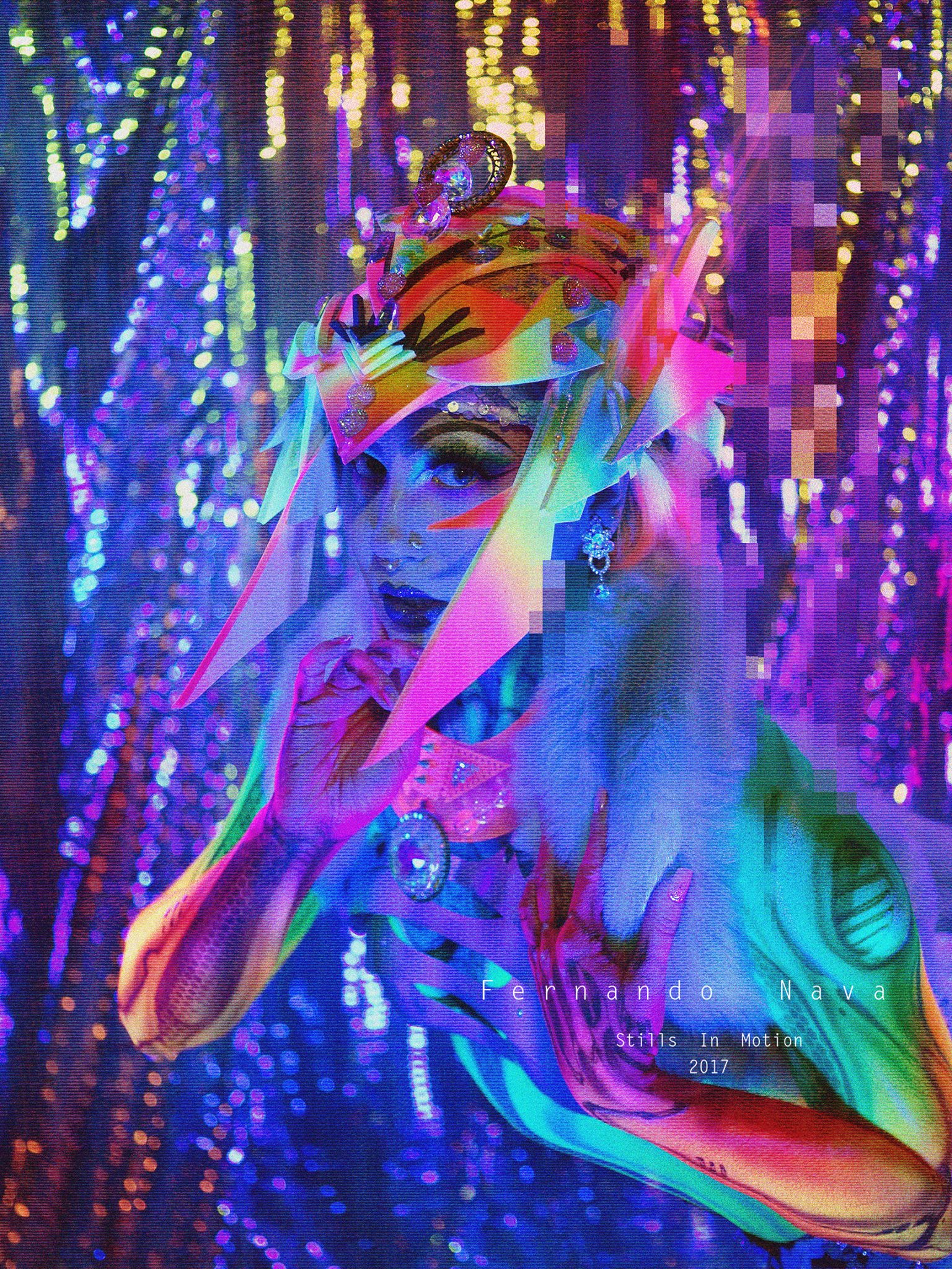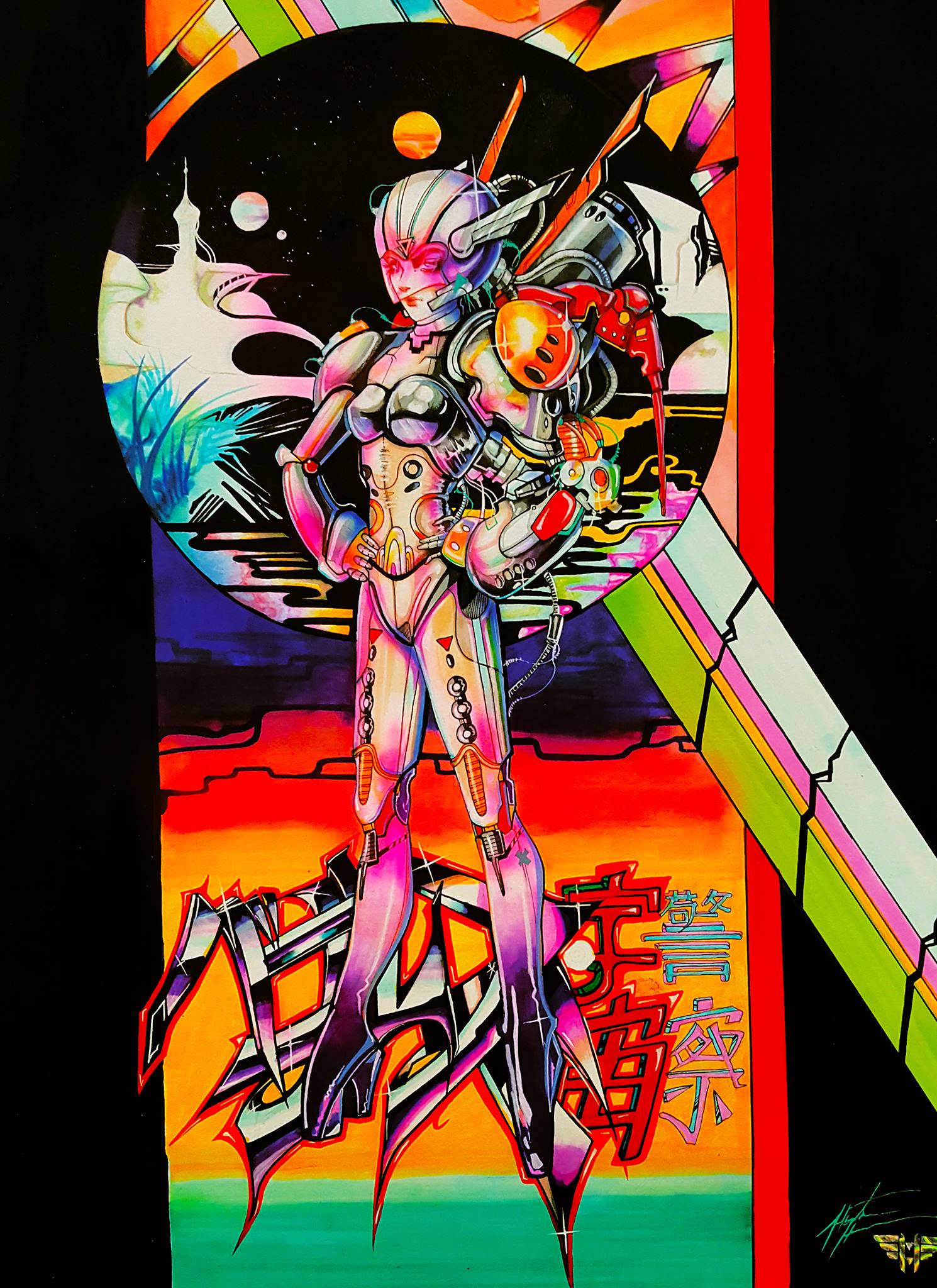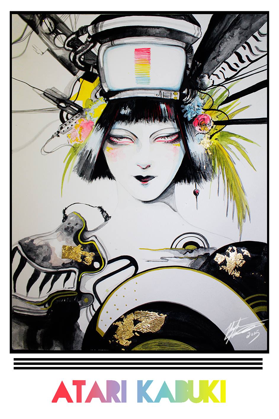 HH: I’ve pretty much had a pencil in my hand since about 6 months old. My first drawing I ever did was trying to replicate the little stick birds I saw on Sesame Street. In my younger years, I would draw HUNDREDS of images every week. I was just a machine. I was always drawing when I was professionally dancing or being stuck in rehearsals. I worked with the Kravenko Ballet which was a USA branch of the Royal Academy of London. So it was pretty much school and that. Art honestly was my ultimate escape and mental masturbation away from all the craziness where I could just be me and collectively take my mind somewhere else…even for just a few seconds. I was a notorious homework scribbler. I’d hand in math homework with entire comic strips all around the sides! I progressively had been studying masters like Amano, Erte, and Mucha at a very young age. Around six years old. My brother had a video game guide slip for Final Fantasy 2 and I practiced every day to replicate the artwork. I was studying color theory and raw shapes at an advanced level. I learned to draw like Amano before I stepped foot into high school at the Las Vegas Academy. My work was so different and unique I was immediately accepted after my audition. (It’s an arts high school and auditions were mandatory at the time). From there I learned hyper-realism and just about every other media and style and had already had an educated background in Photoshop and Corel Painter. My boyfriend and I are actually sponsored by Corel Painter now and do a lot of tech development for them alongside Intel. I actually TAUGHT digital art in high school at sixteen back in 2004 because no one else knew how nor was it taught in high school. I used to take my photo major hour to teach a class to 30 students on using Wacom tablets, calibrations, and speed concept design. I decided to pass on art college even though I was given a full ride to Cooper Union. Art College is one of those things that can make or break you but mostly break you. I find that with certain amounts of “influence” it destroys creativity/originality. I think art college is great if you want to talk about your “society driven” pile of colored rocks smooshed in a corner as a progressive installation. I was better off interning and drawing for myself and letting it build rather than have a professor fill me with false public ideals. The ideas of Steampunk, Synth and Vaporwave style were already in my work avidly before there were ever scenes dedicated to it. When I left high school though I was lucky enough to intern with a 25-year costume design veteran who was Bob Mackie’s assistant here in Vegas during the 80’s. As much as the Synth community goes on about “Synth fashion”, they haven’t the faintest clue about stage fashion/costume from the era and the gaudy over decorated show spectacles that made stage entertainment so magical during the 80’s with such shows as Jubilee, Splash, and the Lido.