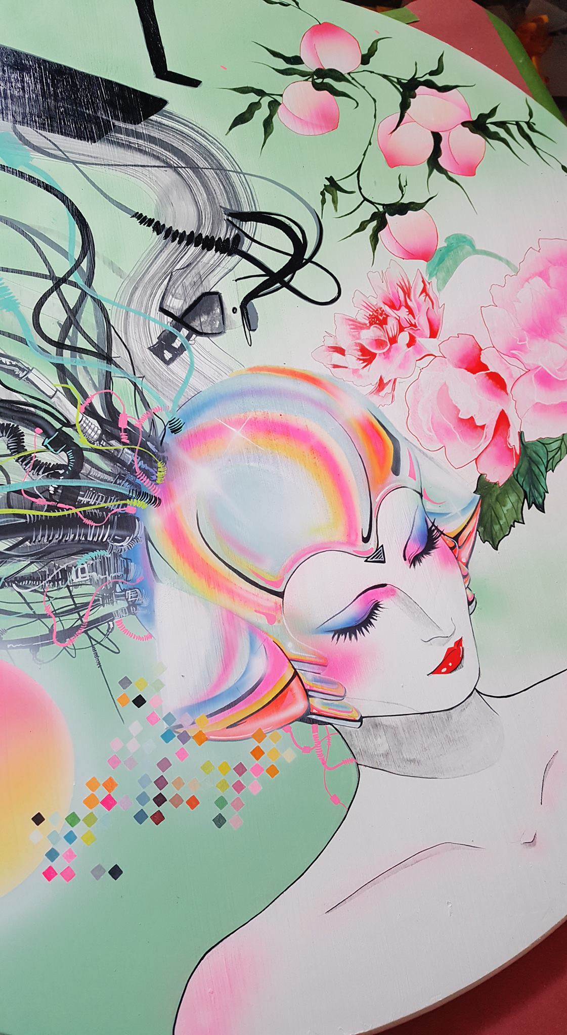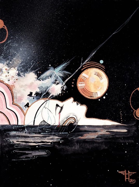 HH: Usually I start with music. I have to figure out a whole story and feeling before I create something. Everything I do is usually painted to particular songs or albums. Once I figure out which one it is, I think of the mood of the main figure. I like to leave them up to perception. Are they sexy? Do they have any feelings? Do they control how you feel? Or are you just glued to their eyes? I always concentrate on the eyes. Classic bedroom eyes. Seducing you. After the main figure is created I move on and think of the secondary imagery. I’m fascinated by 1930’s dystopian Art Deco ideals and aesthetics so I play heavily off that. There’s a fun eerie quality to everything I do. I try to convey things that I have seen within my visions and dreams in a more conductive manner that will allow the viewer to just “peek” into what I know. I’m fascinated by infectious AI, its control on humankind…and how we rid ourselves of it. My work is the discovery of the self. An alternate subconscious timeline. Making you feel inexplainable emotions and a false sense of nostalgia. That feeling of remembering something that never happened, or longing for a memory that isn’t yours.