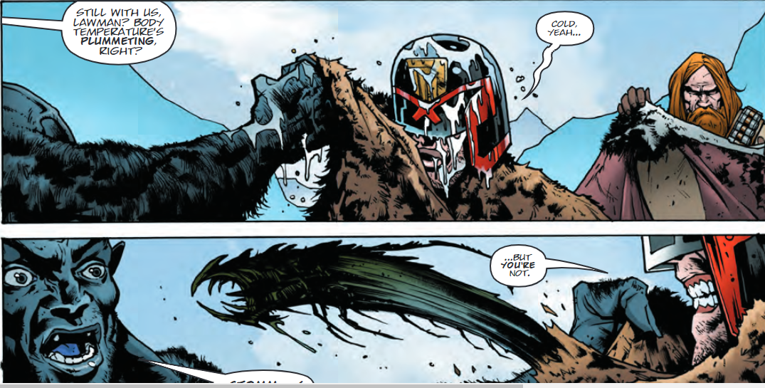 Of the five stories contained within the graphic novel, “Get Sin” features an assault on a fortress in a hostile winter, “War Buds” focuses on a group of former judges coming together to help another from their unit. “Black Snow,” “Echoes,” and “The Stroud” are three connecting stories focusing on Dredd stepping out of his jurisdiction to help a colony in desperate need and what happens after.